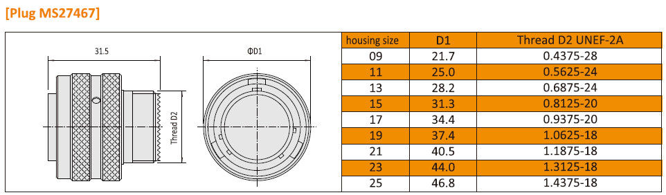 Kích thước cho Amphenol MIL-DTL-38999 I Seriestiêu chuẩn milJY27467 Quân độiBộ kết nối tròn